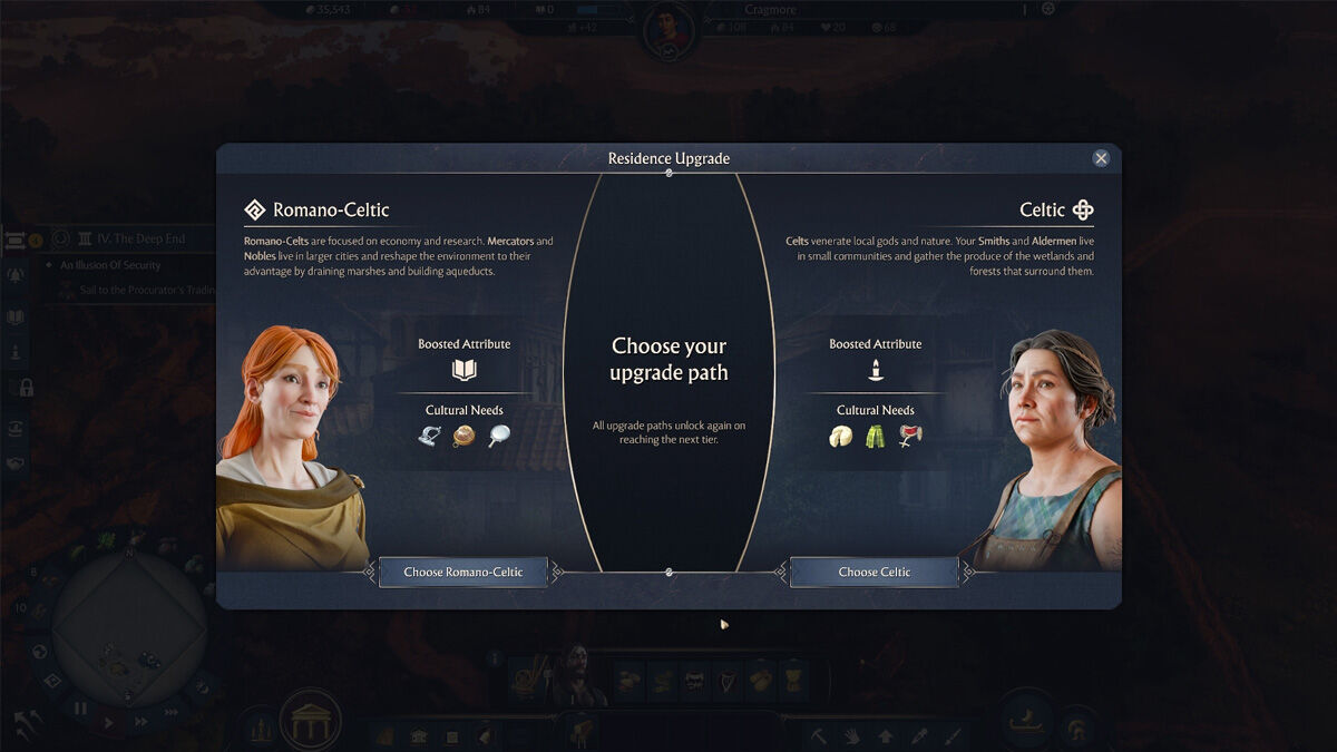 Meanwhile, playing in the lands of Albion brings additional depth to the city management experience of Anno 117: Pax Romana. You begin first by populating your city with Waders (The common Celtic man), yet, this time, you get to choose upgrade paths for your residents, which are essentially ways of living for your people: Do you decide to retain your Roman roots in a Celtic land with a hybrid Romano-Celtic way of life, or do you choose to embrace an unadulterated Celtic culture? Choosing either unlocks different residences which further dictate the needs of your city and, ultimately, the way you play. Deciding on transforming your people to Romano-Celts unlocks Mercators and Nobles, who focus on economy, research, rapid expansion, and the ability to transform their environment by draining marshes and building aqueducts. On the other hand, a Celtic lifestyle demands that you live alongside and utilise the wetlands and forests around you to their full extent, boosting religion and producing goods like cheese.