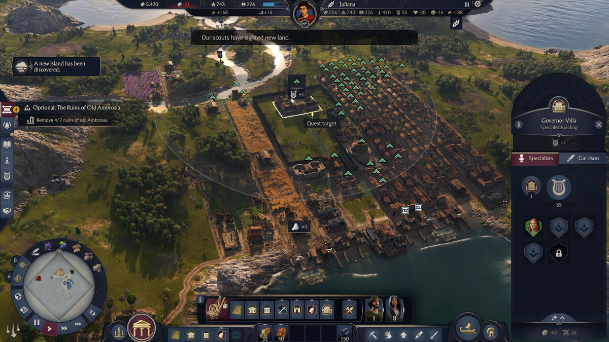 Like other Anno games, seafaring plays a vital role in your cities’ survival, and it is through travelling across oceans that you get to meet new governors and find fresh soil to cultivate or settle on. Meeting new governors not only opens the opportunity for trade routes, which provide steady, consistent exchanges of goods, but also opens you to contracts, where, when fulfilled – like successfully transporting specific items – rewards you with denarii. You are also able to purchase ships or key specialists from these governors, who, when placed in your city’s villa, provide boosts to different statistics like happiness or health. A vast majority of the game’s combat also takes place in the seas, but for most of the beginning hours of Anno 117: Pax Romana, combat takes a back seat as much of the focus falls on managing resources and city building.