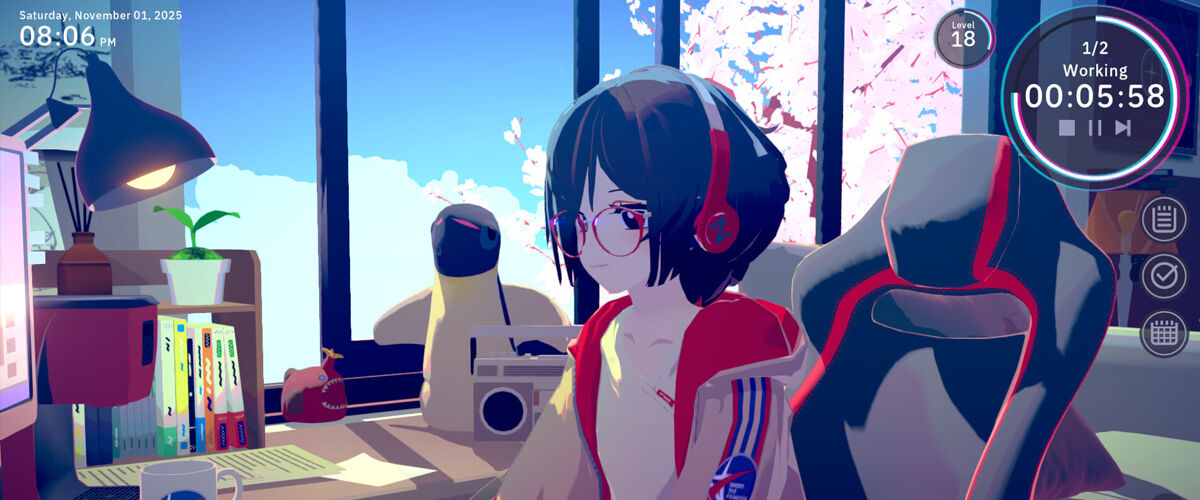 Chill with You: Lo-Fi Story, touted as a “work-focused sound novel game”, adds an interactive element to the formula. Most of its primary functions will be familiar to most, from a calendar and notepad to a to-do list, with a Pomodoro timer allowing for more effective break times, customisable to personal preferences (the standard involves 25-minute work and a five-minute rest interval).
