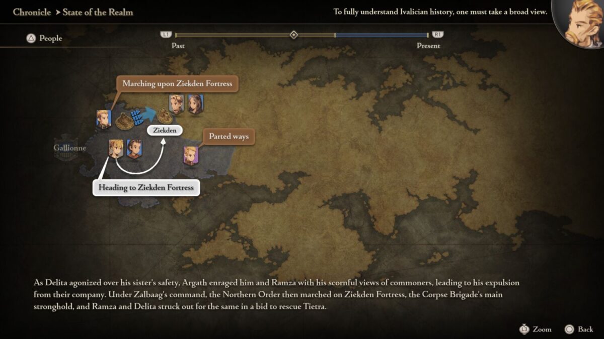 Outside of combat, Final Fantasy Tactics: The Ivalice Chronicles continues its quest for improved accessibility. The lore of Ivalice is dense, and the array of characters can complicate the player’s understanding of their dynamics and roles in the overarching story, so a lot of care went into crafting an interactive timeline called State of the Realm. Taking a page out of Final Fantasy XVI’s Active Time Lore mechanic (a natural progression, considering Creative Business Unit 3 worked on both titles), it offers a comprehensive overview of major past and present events, complete with cutscenes that can be rewatched anytime, a glossary of in-game jargon, a clear, detailed breakdown of the zodiac compatibility chart, and useful tips.