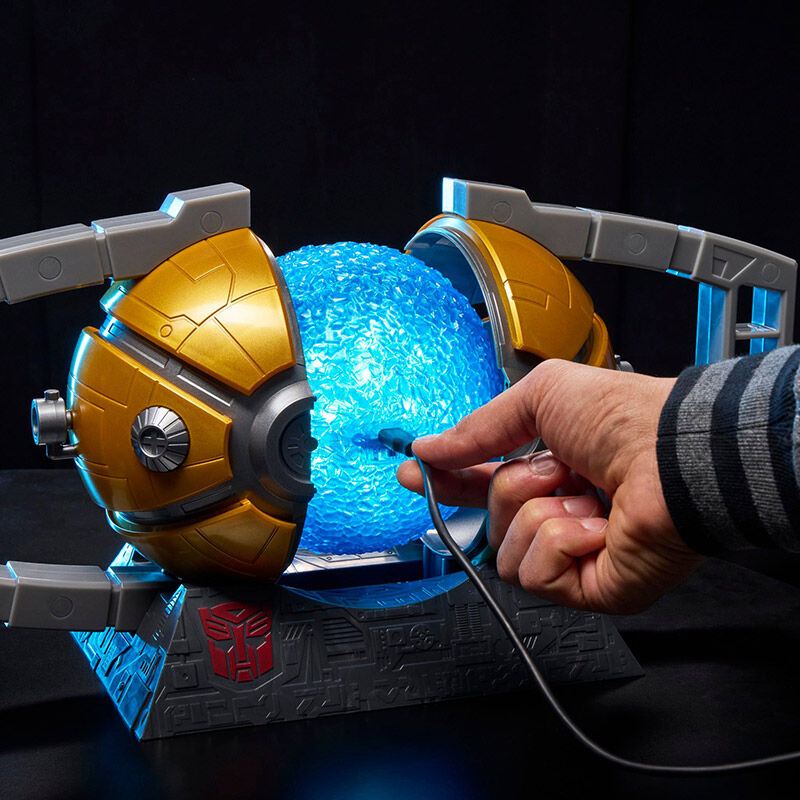 As can be seen in the pictures, this thing of beauty is scaled to human size, so fans can slip their fingers into the handles to pull open the Matrix. Yes, it looks like this thing opens up (sorry Ultra Magnus) as needed. When the frame is pulled open, the pulsing blue lights in the core get brighter and “The Touch” by Stan Bush plays, just as we will always remember from that pivotal moment in the movie. The Matrix of Leadership can also sit on the display stand when open or closed. And finally, it will be rechargeable via a USB-C port located on the back of the inner core.