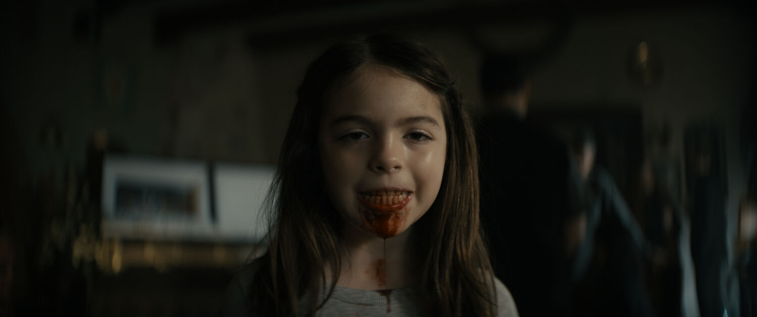 Predictability sets in soon after, though Cronin counters it with a determination to push every image as far as it will go. Violence arrives in lurid bursts – eyes forced from their sockets, teeth finding new homes, bodies hurled into harm before being finished off with cruel enthusiasm – each encounter treated like a chance to try out another grisly variation. Visual choices heighten that sense of unease, as split diopter shots keep Katie looming in the foreground, swelling into something almost grotesque as her parents struggle to focus on anything else, while an overabundance of close-ups of mouths chewing, fluids escaping, bodies reacting pushes the film into something queasily intimate.